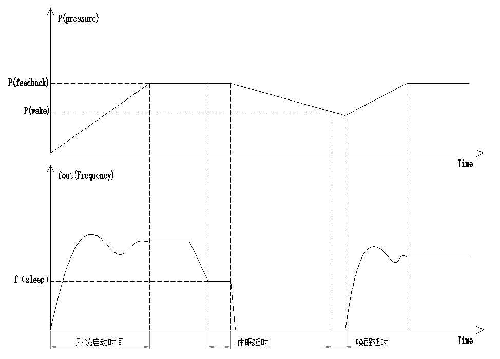 在恒壓供水控制系統(tǒng)中,為了節(jié)省電能和防止水泵頻繁啟停,要求當(dāng)泵的速度低至輸出頻率下限,延時(shí)一段時(shí)間后變頻器自動(dòng)停止輸出,進(jìn)入休眠狀態(tài);然后當(dāng)壓力反饋值低于設(shè)定壓力下限值時(shí),再自動(dòng)喚醒變頻器。