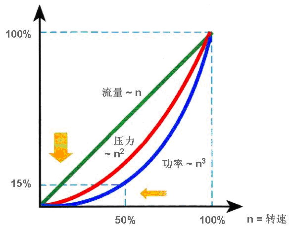 正如前面提到的,軸功率P與轉(zhuǎn)速n的三次方成正比。采用變頻器進(jìn)行調(diào)速,當(dāng)流量下降到80%時(shí),轉(zhuǎn)速也下降到80%,而軸功率N將下降到額定功率的51.2%,如果流量下降到60%,軸功率N可下降到額定功率的21.6%,當(dāng)然還需要考慮由于轉(zhuǎn)速降低會(huì)引起的效率降低及附加控制裝置的效率影響等.即使這樣,這個(gè)節(jié)能數(shù)字也是很可觀的,因此在裝有風(fēng)機(jī)水泵的機(jī)械中,采用轉(zhuǎn)速控制方式來(lái)調(diào)節(jié)風(fēng)量或流量,在節(jié)能上是個(gè)有效的方法。