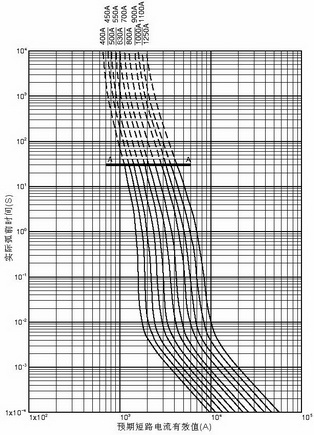 弧前時間具體值可從圖五查得??梢圆榈筋~定電流800A的快速熔斷器,當短路電流為13222A時,弧前時間<2mS;當短路電流為99165A時,弧前時間< 0.1mS。