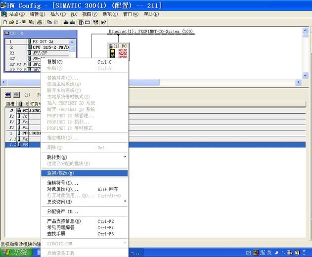 STEP7 硬件配置的 ONLINE 模式提供簡易的在線調(diào)試功能,可以操作現(xiàn)場變頻器, 檢查配置和接線是否正確。在 ONLINE 模式,PLC 運行狀態(tài)下,選中從站丹佛斯變頻器的 圖標(biāo),再點擊從站的 1.2 插槽,示例中顯示為“PPO 4 – 6/6 Words,Danf~”模塊,按鼠標(biāo) 右鍵,選擇“監(jiān)視/修改(M)”。