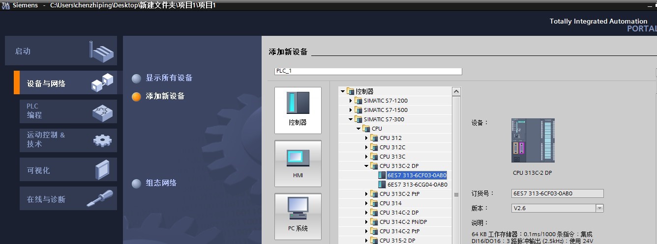 四、添加 PLC 主機(jī),示例中使用的是 S7-300 (6ES7 313-6CF03-0AB0):