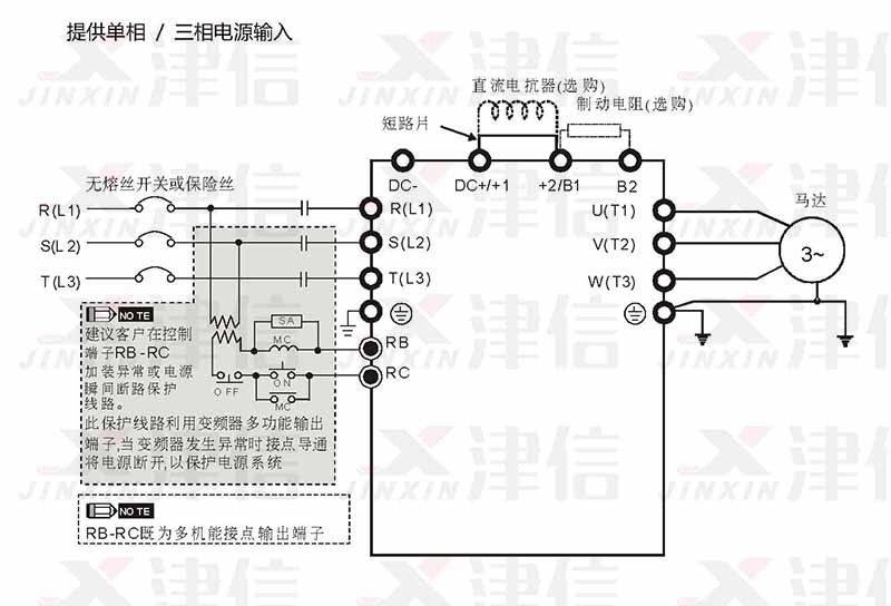 變頻器的主回路電源端子 R/L1、S/L2、T/L3 是輸入電源端。如果將電源錯(cuò) 誤連接于真E端子,則將損壞變頻器。另外應(yīng)確認(rèn)電源應(yīng)在銘牌標(biāo)示的允許
