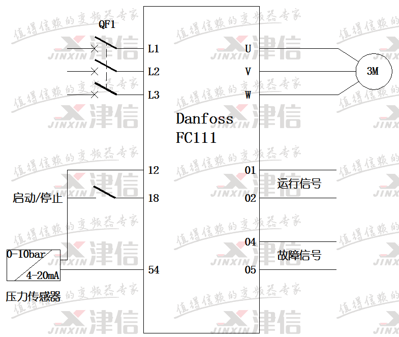 三、FC111單泵恒壓控制接線示意圖如下: