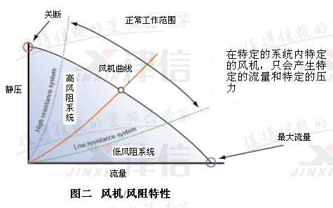 選擇風機的基本原則:在特定的系統(tǒng)里特定的風機,只會產(chǎn)生特定的流量和特定的壓力。風機輸出壓力特性曲線和系統(tǒng)風阻特性曲線的交點就是風機的工作點。