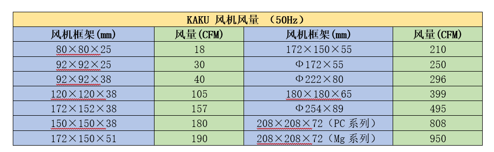 下表列出市場上比較常見的卡固(KAKU)風機的數(shù)據(jù),作為我們上面例子的風機選型參考。