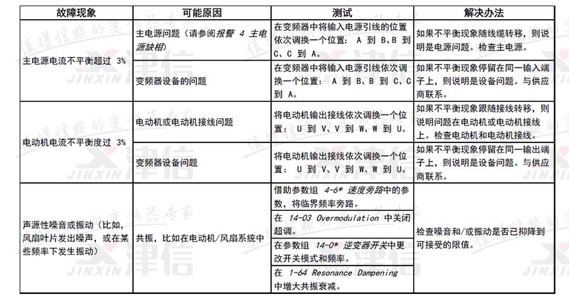 | 4 | 主電源缺相 1) | X | X | X | 供電側缺相,或電壓嚴重失衡。檢查供電電壓。 |
