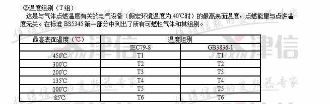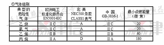注:中國GB3836標準規定ⅡC級最小點燃能量為19微焦耳,ⅡA級最小點燃能量為200微焦耳。氣體分組和點燃溫度,在一定環境溫度和壓力下與可燃性氣體和空氣的混合濃度有關。