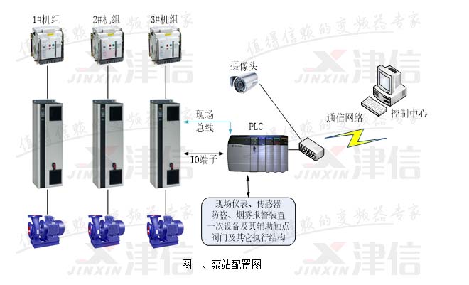 泵站現場由PLC進行控制,現場情況通過通信網絡傳送至控制中心。其中PLC對變頻器的控制采取現場總線加數字量I/O端子兩種方式同時進行。另外,還設置了防盜、煙霧報警裝置;泵站到監控中心可采用無線GPRS(帶寬較低,不能傳輸連續圖像)或有線網絡(光纖網絡可達1000 Mbps)通訊,若泵站到控制中心的通信網絡帶寬足夠,還可以添加攝像頭,以實現對泵站現場情況的遠程監控。