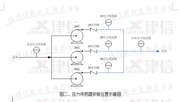 在正常情況下,圖中藍色管路各處的壓力基本一致,1#壓力變送器、2#壓力變送器、3#壓力變送器、出水壓力變送器四個變送器所測量到的壓力值也應該相近。如果某一儀表與另外幾只儀表的測量值偏差過大,則可判定該儀表發生故障,PLC發出報警信息,并忽略該機組的壓力反饋值。