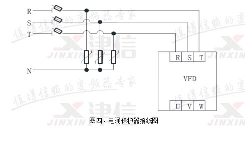 電網質量不佳或遭遇雷擊可能會導致突波電壓,對變頻器、PLC等控制設備造成嚴重危害。一般變頻器內部都有內置瞬間高壓保護器件,但為了獲得更好的保護效果,應在無人值守泵站的主電源側加裝浪涌電壓保護裝置,一種典型的電涌保護器接線方式如圖四所示: