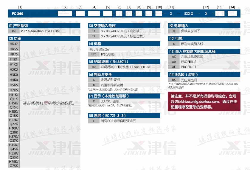 如FC360H1K5T4E20H2BXCDXXSXXXXALBX,代表380V,1.5KW,IP20,C3等級(jí)內(nèi)置濾波器,內(nèi)置制動(dòng),PROFINET現(xiàn)場(chǎng)總線