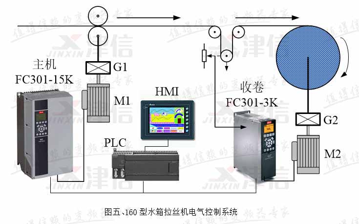 水箱拉絲機是子午線輪胎用鋼簾線生產企業的關鍵設備,其收卷控制是變頻器跳舞輪位置反饋控制。由于生產速度快,用量大,加上環境比較惡劣,因此要求采用性能優異,穩定性好,質量可靠和抗腐蝕能力強的變頻器。我廠為拉拔0.22毫米以下線徑的鋼簾線定制了160型新型水箱拉絲機上,全部選用了丹佛斯最新推出的FC系列變頻器作收卷和主傳動驅動,取得了很好的運行效果。
