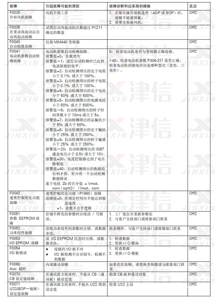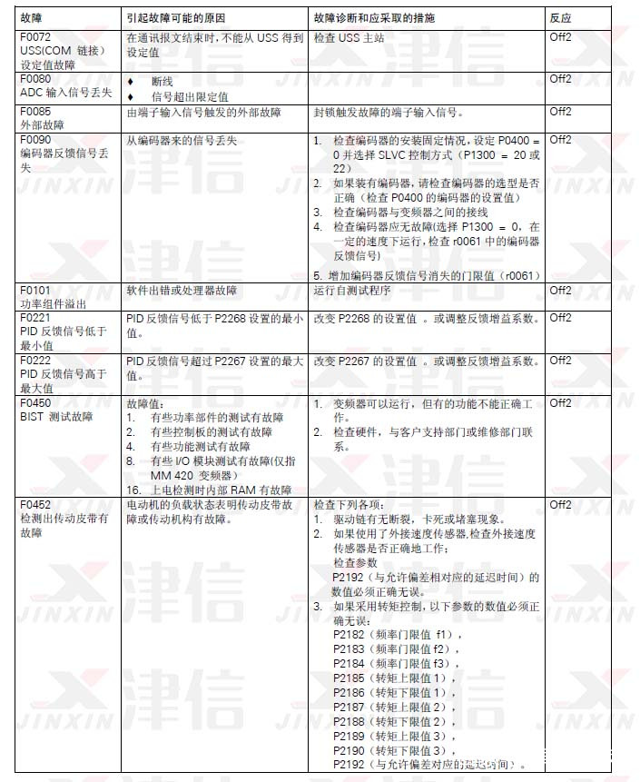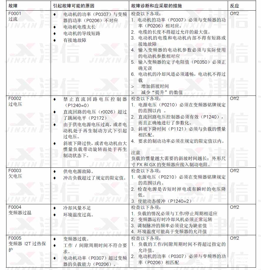 故障信息以故障碼序號的形式存放在參數(shù)R0947 中(例如,F(xiàn)0003=3)。相關(guān)的故障值可以在參數(shù)R0949 中查到,如果該故障沒有相關(guān)的故障值,R0949 中將輸入0。而且,可以讀出故障發(fā)生的時間(R0948)和存放在參數(shù)R0947 中的故障信息序號(P0952)。