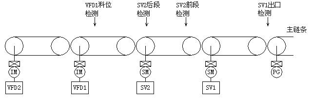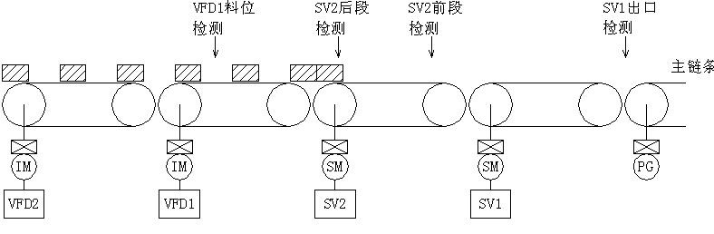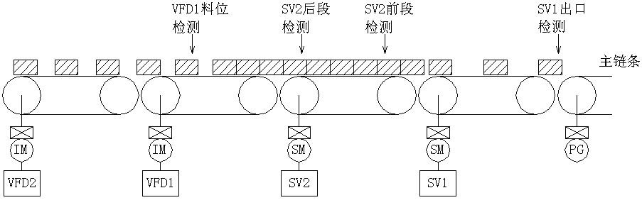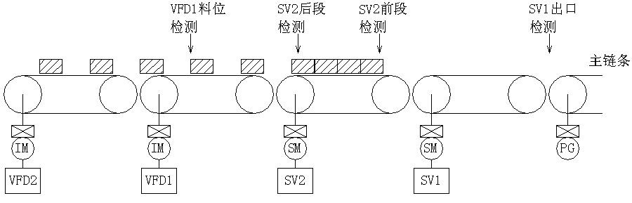 在圖1中,VFD1料位檢測(cè)傳感器沒有檢測(cè)到物料時(shí),VFD2以稍高于VFD1的速度,二者均高速運(yùn)行。當(dāng)檢測(cè)到物料時(shí),同時(shí)降速運(yùn)行,但VFD2速度仍稍高于VFD1。此時(shí)SV2和SV1以及包裝機(jī)并未運(yùn)行。在圖2中可以看到在SV2后段檢測(cè)傳感器檢測(cè)到物料以后,SV2啟動(dòng)。當(dāng)SV2前段檢測(cè)傳感器檢測(cè)到物料且SV2后段傳感器依然有信號(hào)時(shí),啟動(dòng)包裝機(jī),此時(shí)SV1也啟