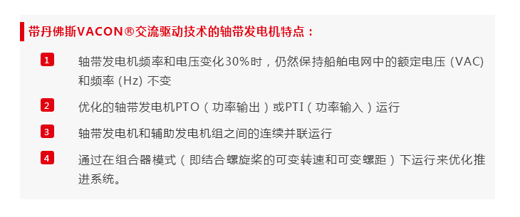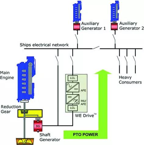 船舶軸帶發電機連接到主發動機軸,速度隨發動機轉速而變化。由于船舶電網的恒壓恒頻要求,發動機轉速不能更改。這限制了發動機轉速的任何變化,從而限制了傳統配置的效率。采用交流驅動技術的軸帶發電機能在海上動態運輸條件下,使用船舶電網的電力來大幅度提高主發動機的主推進力。該功能被稱為PTI(功率輸入)。