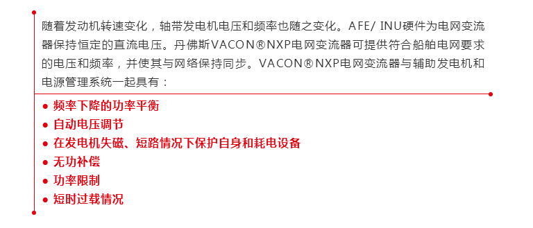 VACON®NXP電網變流器由VACON® AFE單元、船舶電網上的LCL濾波器以及專用軟件組成。集成了AFE/逆變器與VACON®NXP電網變流器的套件被安裝在軸帶發電機和船舶電網之間。如圖所示,通過兩個輔助發電機和軸帶發電機的幫助,為重載耗電設備提供恒壓恒頻的電力。